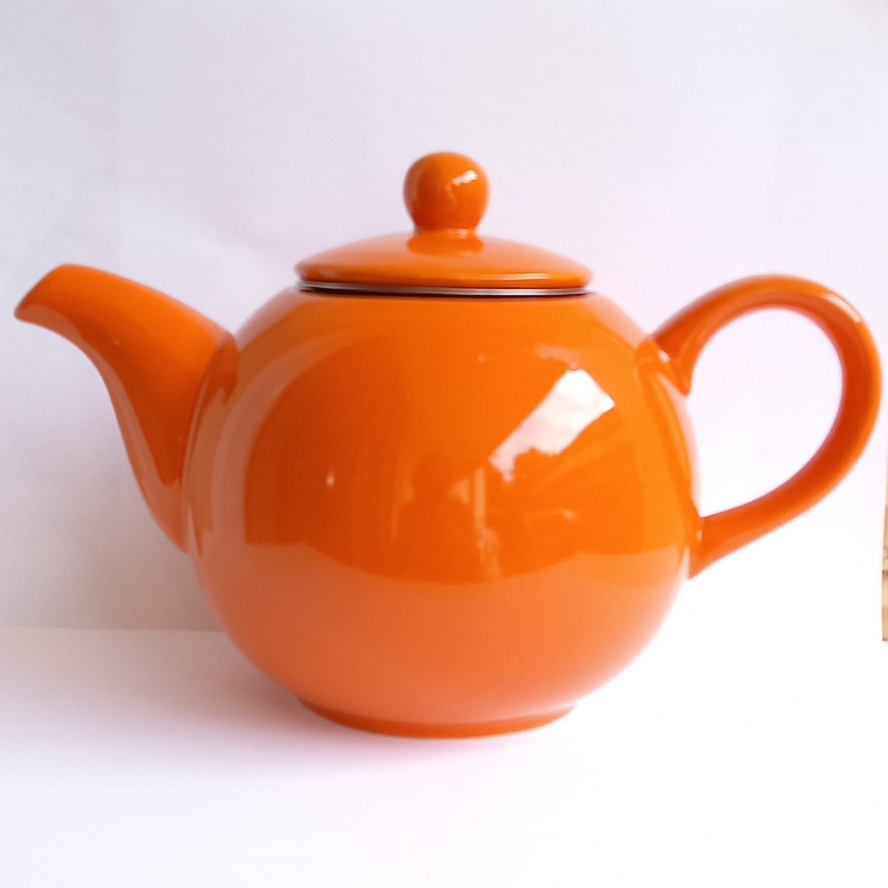 Tetera de gres Versa, cerámica color naranja estilo clásico, capacidad para 1 l, con filtro de acero inoxidable, se puede lavar en lavavajillas y calentar en microondas.